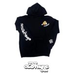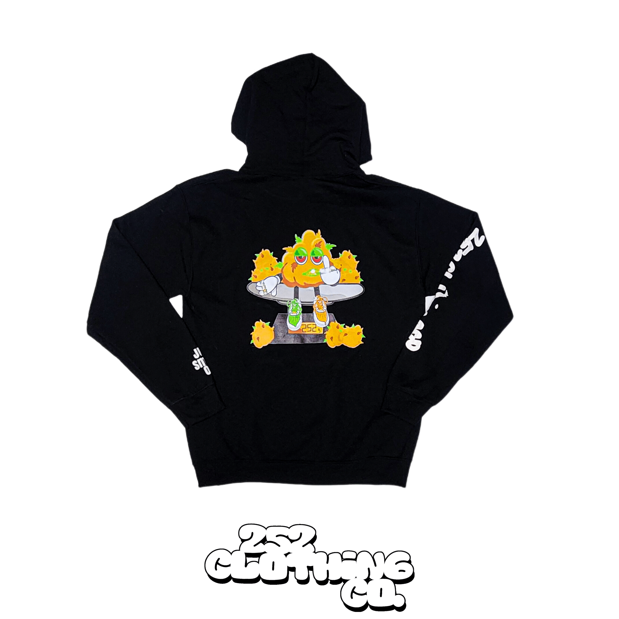 Our budman O sitting on his scale printed on a soft 50/50 blend of cotton-polyester hoodies.