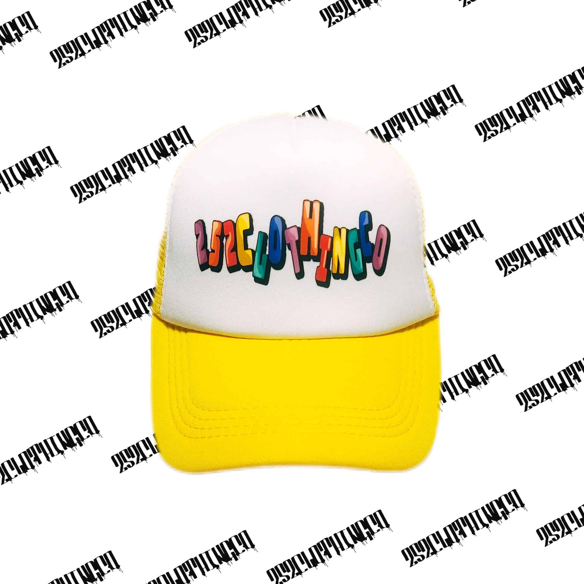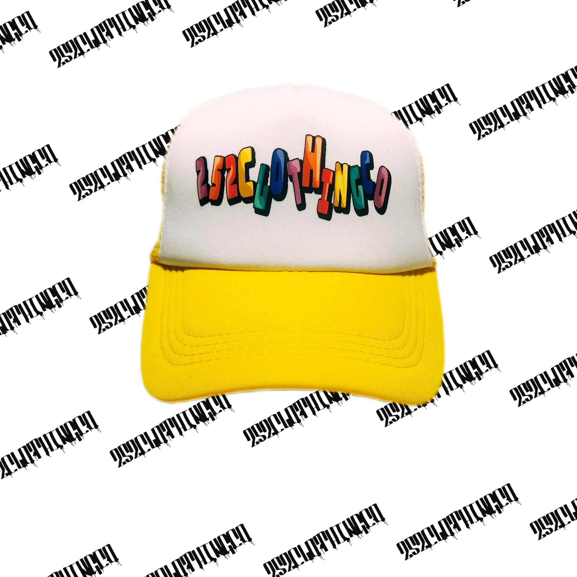 Our color pop script on a snapback mesh amd foam trucker hat.